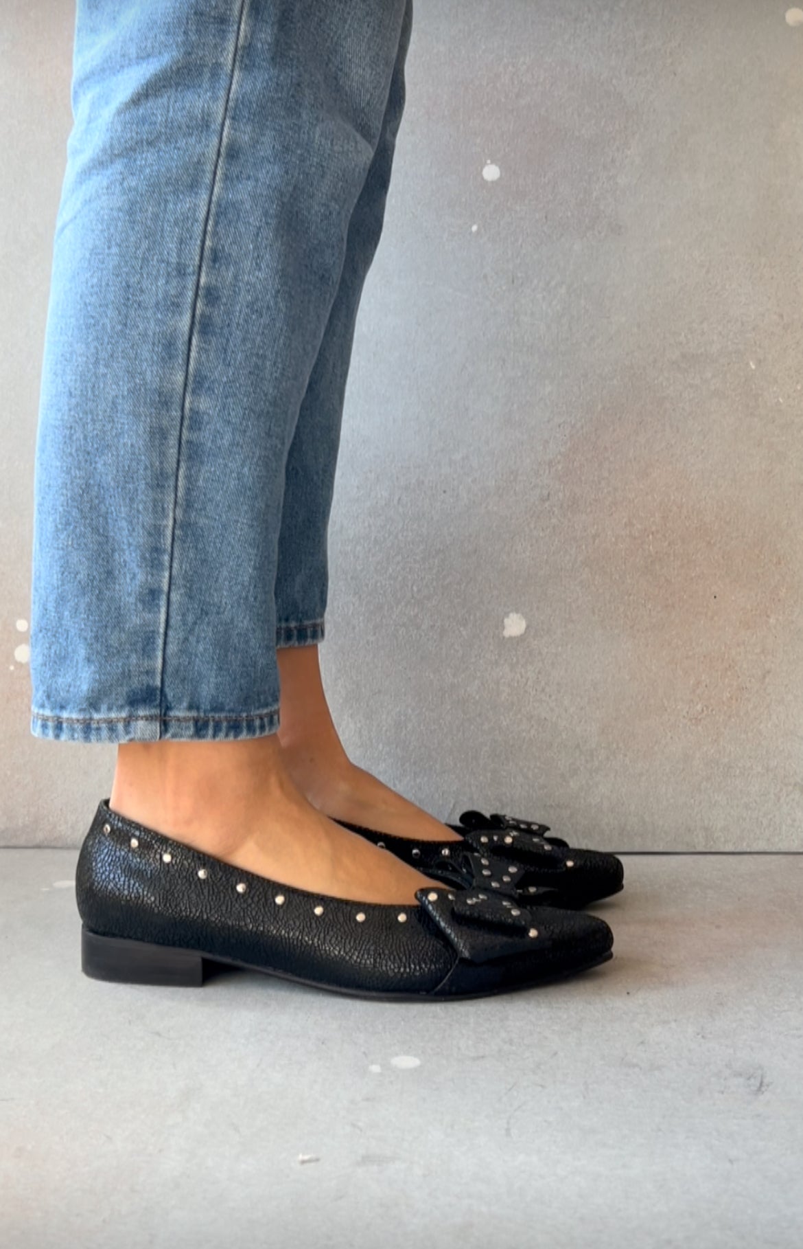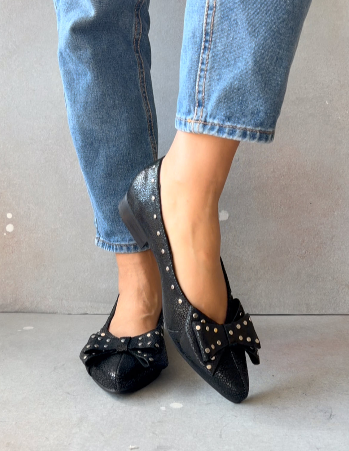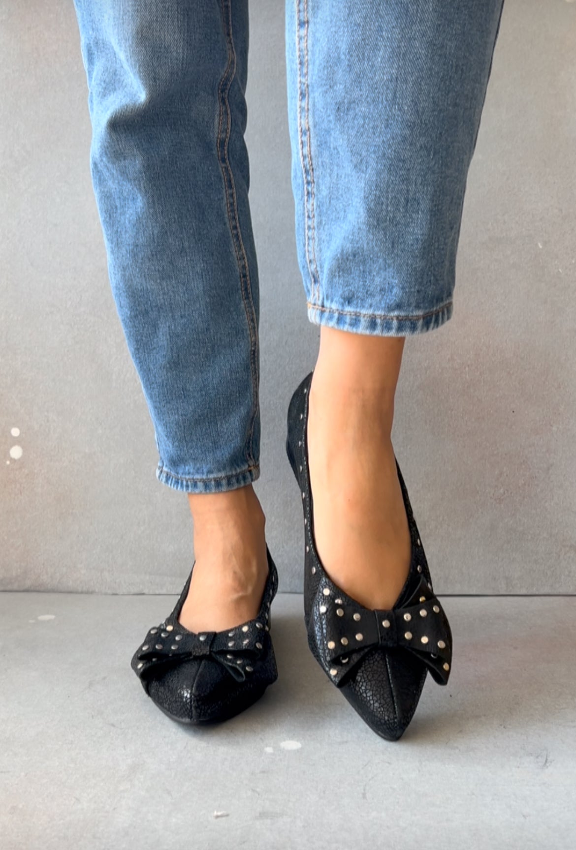 Textura con carácter, tachas sutiles y un lazo que equilibra perfecto entre lo femenino y lo atrevido. Un zapato que se nota, pero sin gritar.